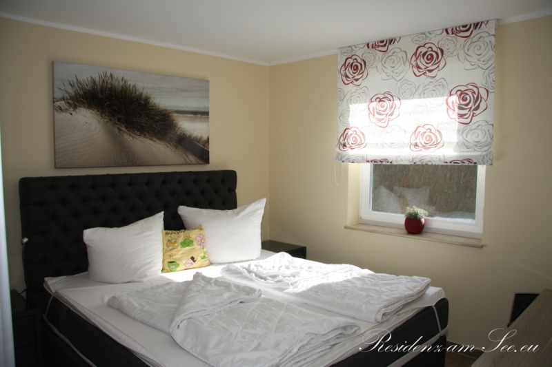 Vom Flur geht es zum einen ab in das erste Schlafzimmer. Dieses ist, wie alle anderen Schlafzimmer auch, ausgestattet mit einem Boxspringbett (180 cm x 200 cm), einem großen Kleiderschrank, Fernseher sowie einem kleinen Tisch mit Stuhl.